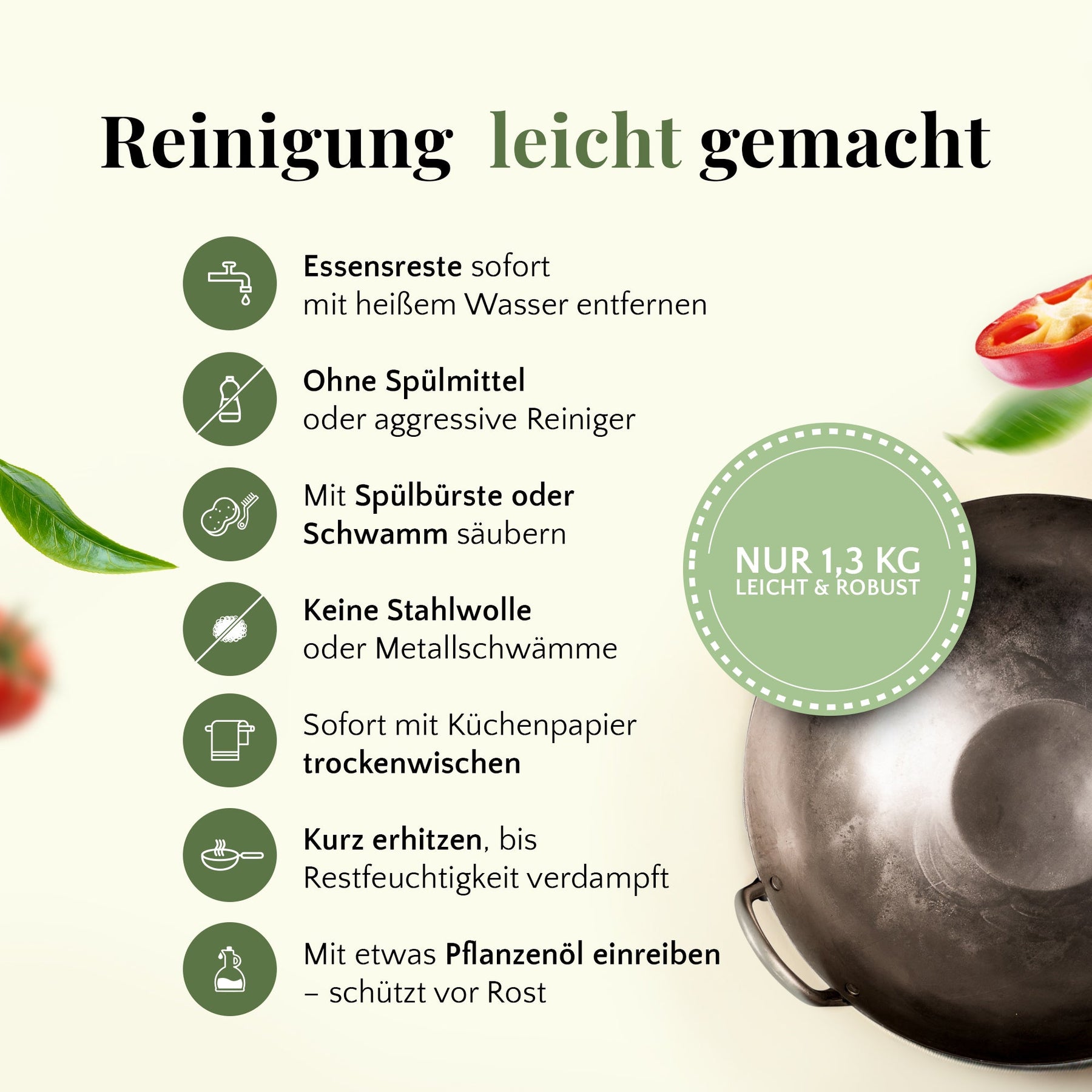 Bitte Beachten: Vor der ersten Nutzung des Woks, muss dieser eingebrannt werden. Eine Anleitung dazu liegt dem Wok bei. Nach einmaligem Einbrennen bildet sich eine natürliche Antihaft-Beschichtung, was insbesondere das gesunde Braten mit wenig Öl ermöglicht.