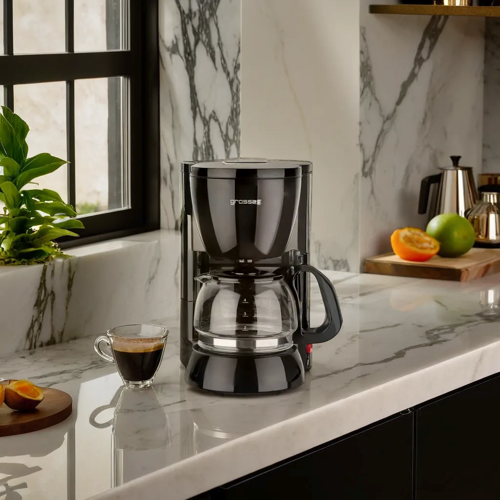 Die Glaskanne hat einen ergonomisch geformten Griff und läßt sich zielgenau und tropffrei ausgießen.